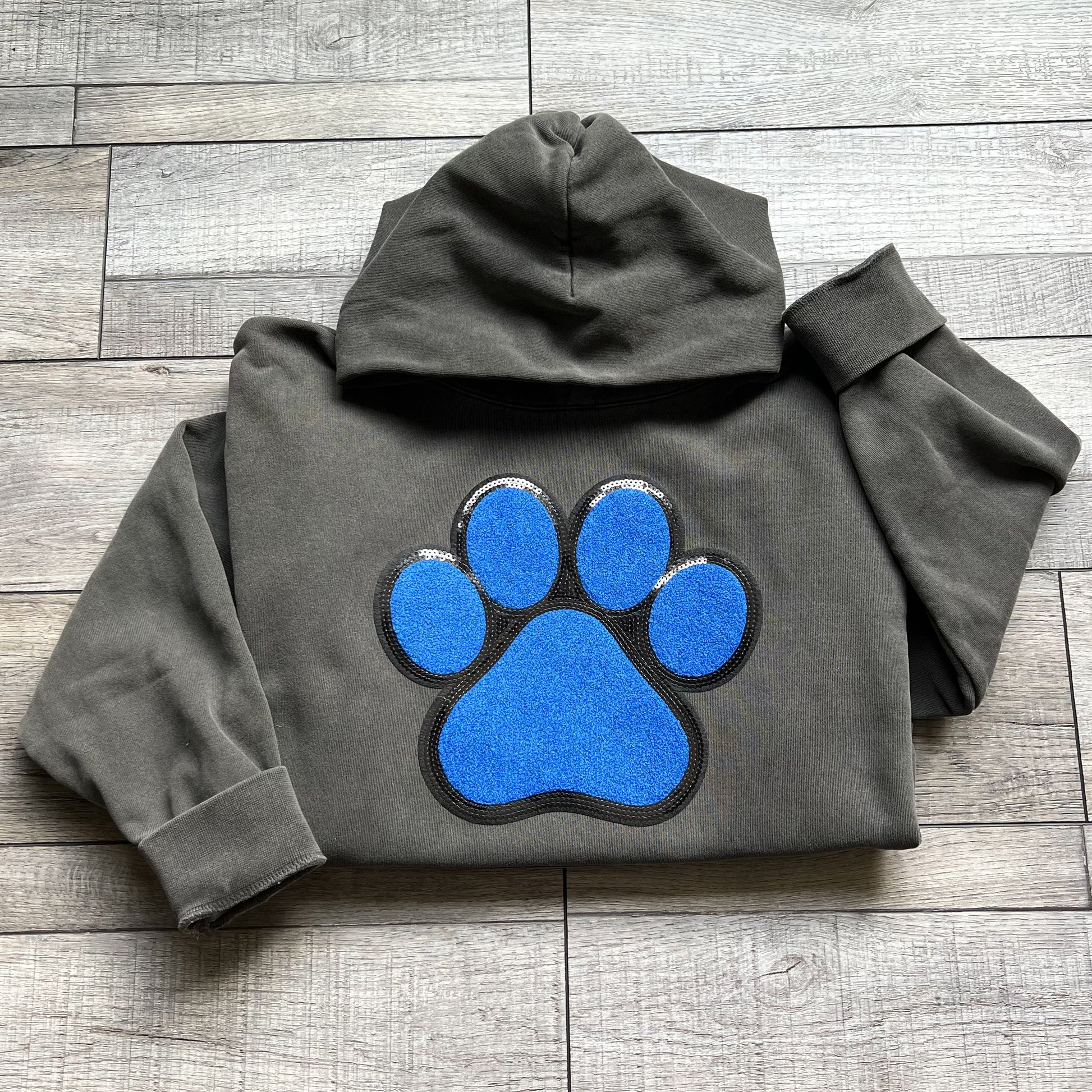 Big paw chenille patch on a faded black hoodie. Paw color available in Royal, Purple, Red or White!