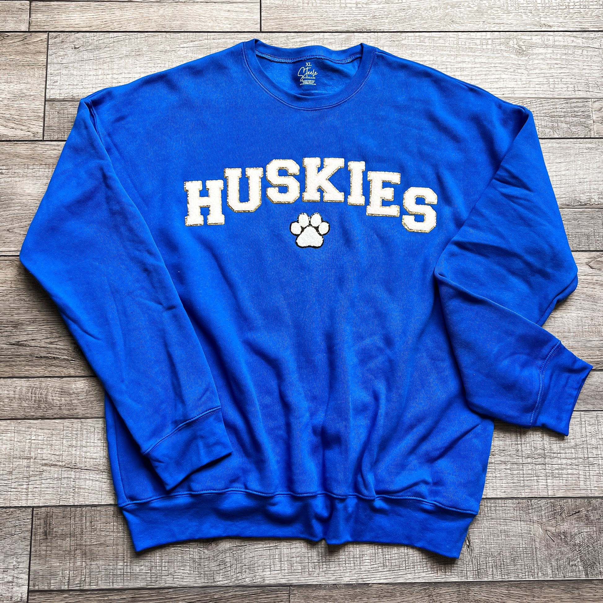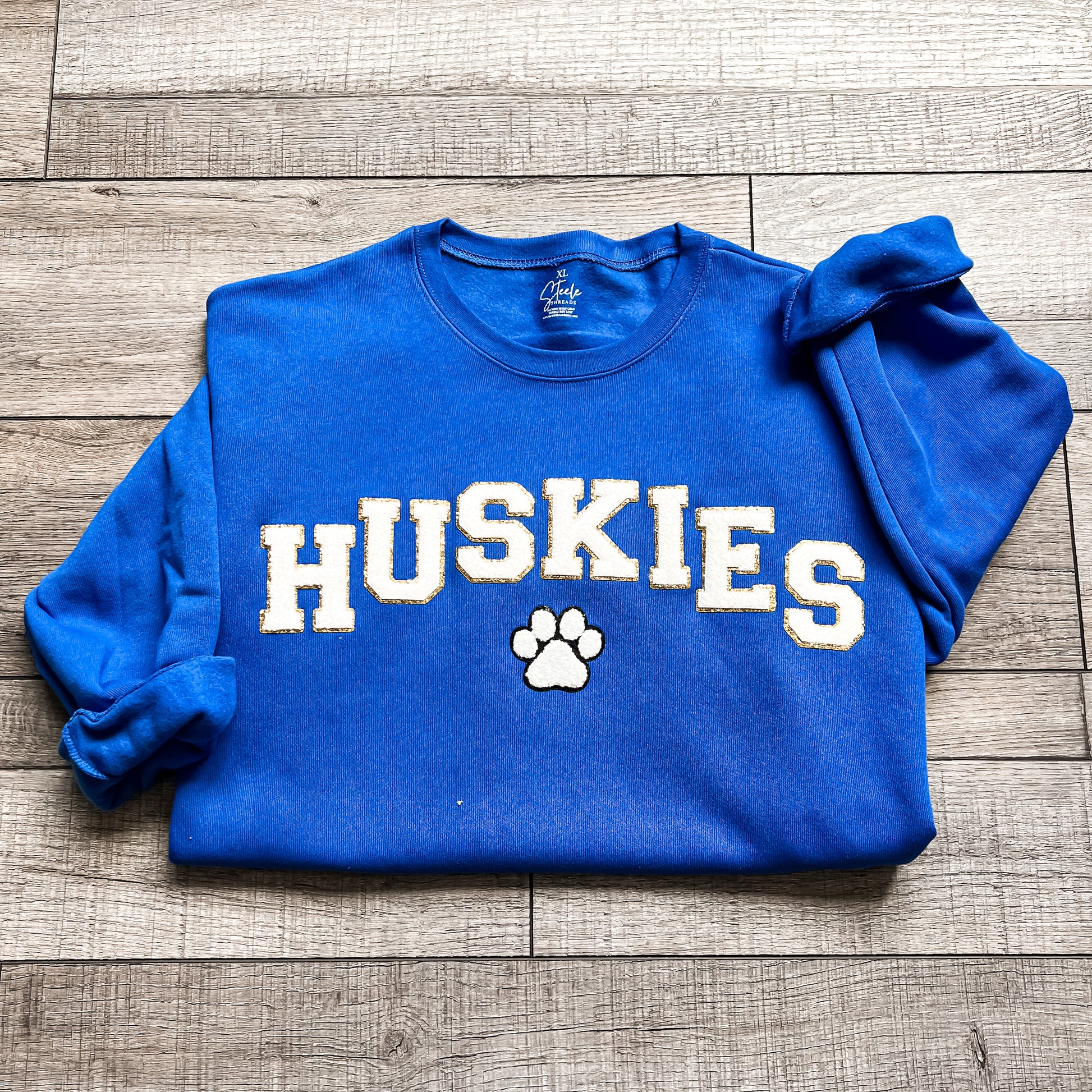 White and gold HUSKIES patch design on a royal blue crewneck or hoodie.